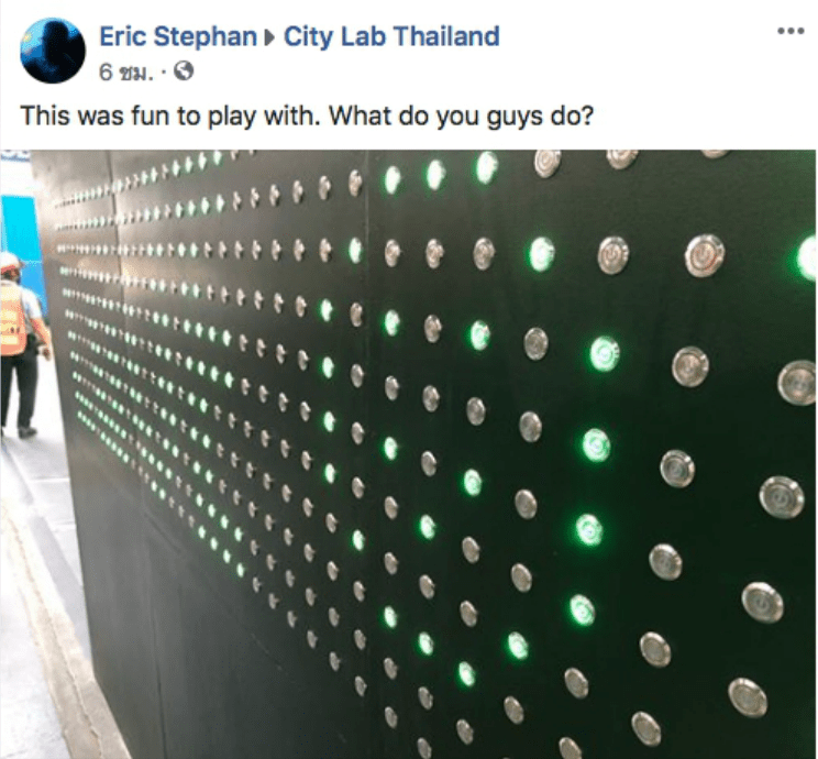 Silom City Lab is an experimental urban design project. The project explores the possibility of what could be the future of the street of one the most well know office area in Bangkok. Dot Canvas is an interactive digital wall that Let’s bypassers create any artwork to release stress after the long day at work. The wall is made out of 429 light buttons on 11 * 39 grid. The simple design of this wall allows people of any age to engage with this panel.